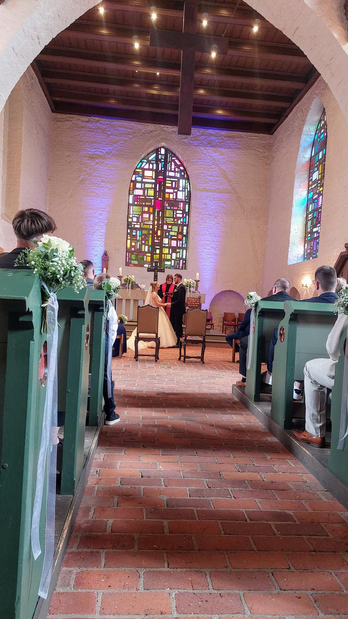 Die Wunschfahrt ging heute zur kirchlichen Trauung des Enkelsohnes. Wir Wunscherfüllerinnen fuhren von Elmshorn nach Lübeck, um Herrn H. und seine Ehefrau abzuholen. Wir hatten großes Glück, denn eine große Parklücke war für uns frei – direkt vor dem Haus. Wir wurden schon freudig begrüßt von dem Ehepaar, das voller Vorfreude war. Herr H. war durch seine schwere Erkrankung nicht mehr in der Lage, selbst mit seinem 29 Jahre alten Benz zur Hochzeit zu fahren. Stolz zeigte er uns ein Bild von seinem Schmuckstück, das er gepflegt und gehegt hatte und das nun in der Familie weitergegeben wurde. Marlene und ich hakten ihn unter, und wir gingen die Treppe hinunter ins Wunschmobil. Wir wurden schnell vertraut. Herr H. hat seinen Humor nicht verloren und erzählte auch einige Witze. Nach einer kurzen Fahrt nach Sandesneben tranken wir in einer Bäckerei noch einen Kaffee und die Zeit verging im Fluge. Nun wurde es aber Zeit: An der Kirche angekommen, mussten wir erst einmal mit dem Rollstuhl eine starke Steigung überwinden. Angekommen wurden wir von der ganzen Familie freudig begrüßt, die sich riesig freute, dass Opa und Oma dabei sein konnten. Der Ehemann wartete aufgeregt auf seine Braut – und dann kam sie auch schon. Sie war wunderschön und alle weinten. Eine Sängerin mit einer tollen Stimme hat für das Brautpaar gesungen. Es war einfach wundervoll.